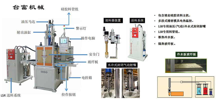 臺(tái)富機(jī)械有限公司可根據(jù)客戶的要求設(shè)計(jì)所需的液態(tài)硅膠注塑成型設(shè)備,再配合歐、日、臺(tái)名廠的組配件和研發(fā)團(tuán)隊(duì)不斷改進(jìn)并提供全套的液態(tài)硅膠設(shè)備的解決方案:送料機(jī)、成型機(jī)、混配系統(tǒng)、色漿泵、硅膠模具等,讓產(chǎn)品達(dá)至客戶理想的水準(zhǔn)如:成本低、效率 更快、精度高、壽命更長、操作維護(hù)更加便捷方便