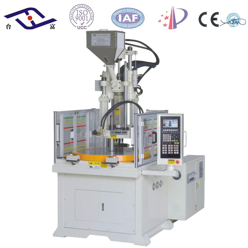 ★配備有旋轉臺面、移動臺面及傾斜臺面等形式,容易實現嵌件成型、模內組合成型。(立式圓盤注塑機,360度可旋轉,立式滑板注塑機可左右交潛滑動,一模成型,一械在外部做嵌件動作)