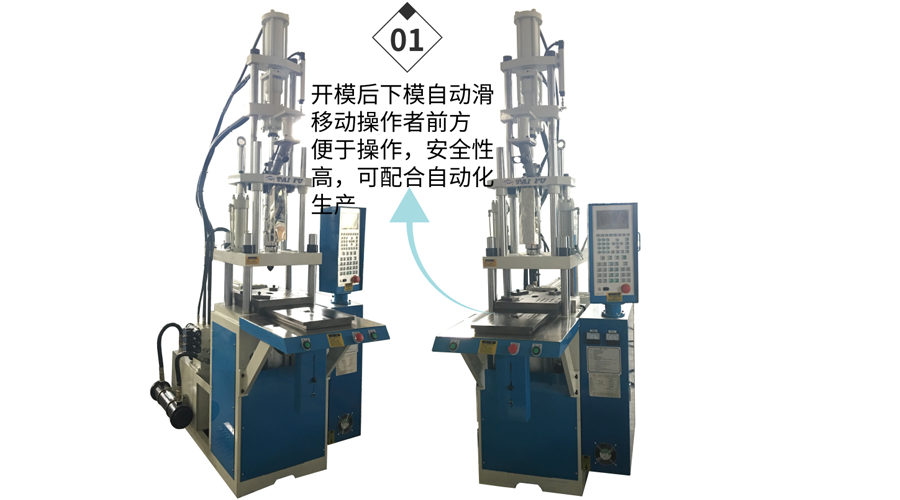 1、在V機(jī)種系列上加裝單滑模,讓機(jī)械完成一個(gè)循環(huán)動作,在關(guān)模后,下模自動滑移到操作者前方,更便于操作,安全性高且成品頂出也在外部完成。